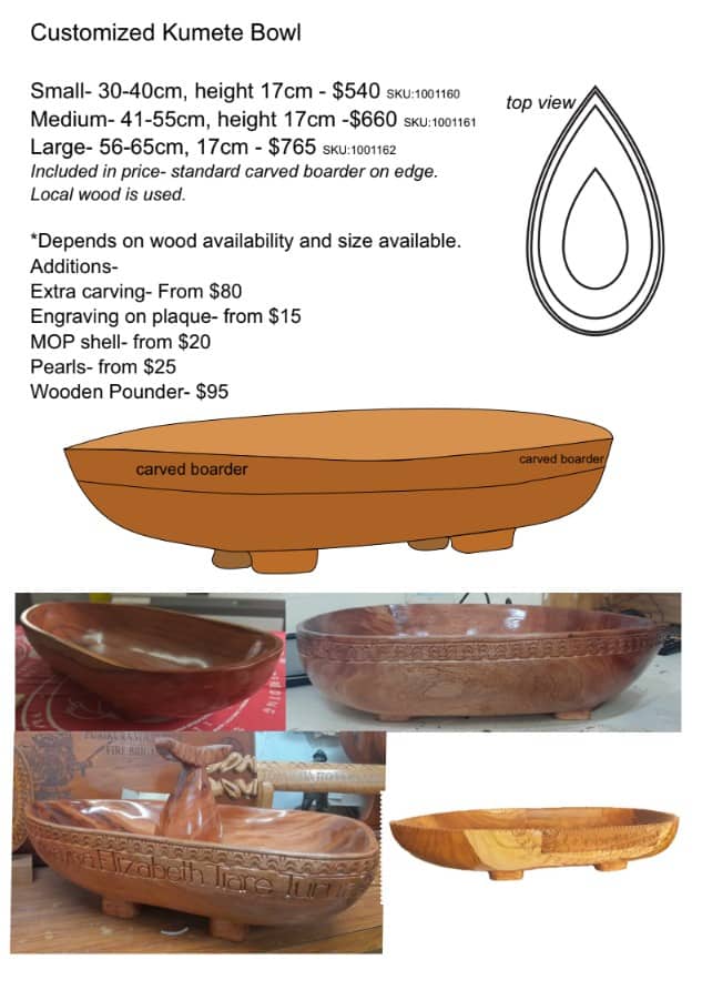 At Island Craft Ltd., we specialize in crafting kumete bowls to order, tailoring each piece to your vision with custom designs and intricate engravings that blend traditional Polynesian motifs with modern personalization. Whether you’re envisioning a unique pattern inspired by Cook Islands heritage or a bespoke engraving for a special gift, our skilled artisans use sustainable hardwoods like tamanu to bring your ideas to life—perfect for feasts, ceremonies, or cherished heirlooms. Contact us today to start your custom creation!