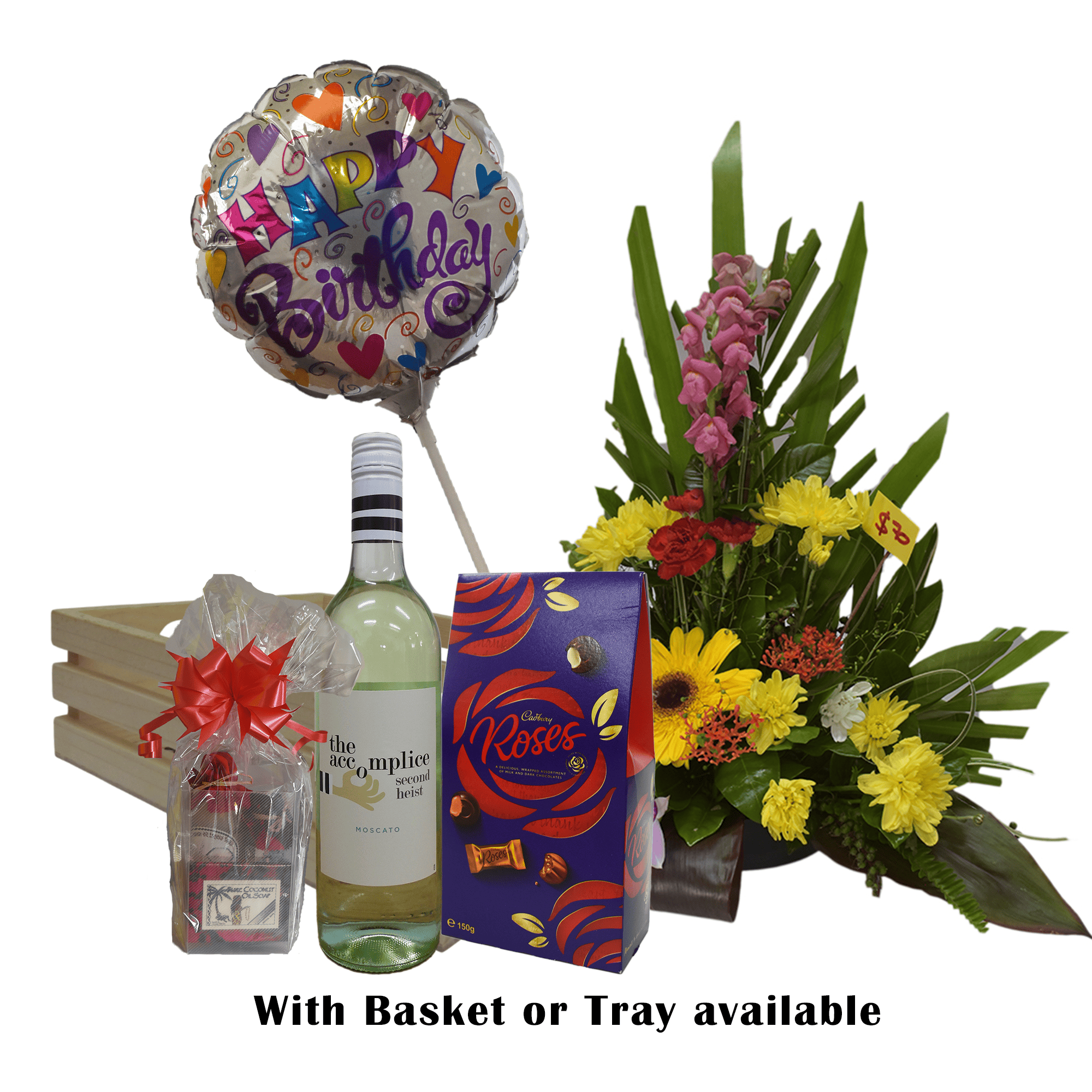 Fresh Flower arrangement with birthday, chocolate, wine, beauty pack