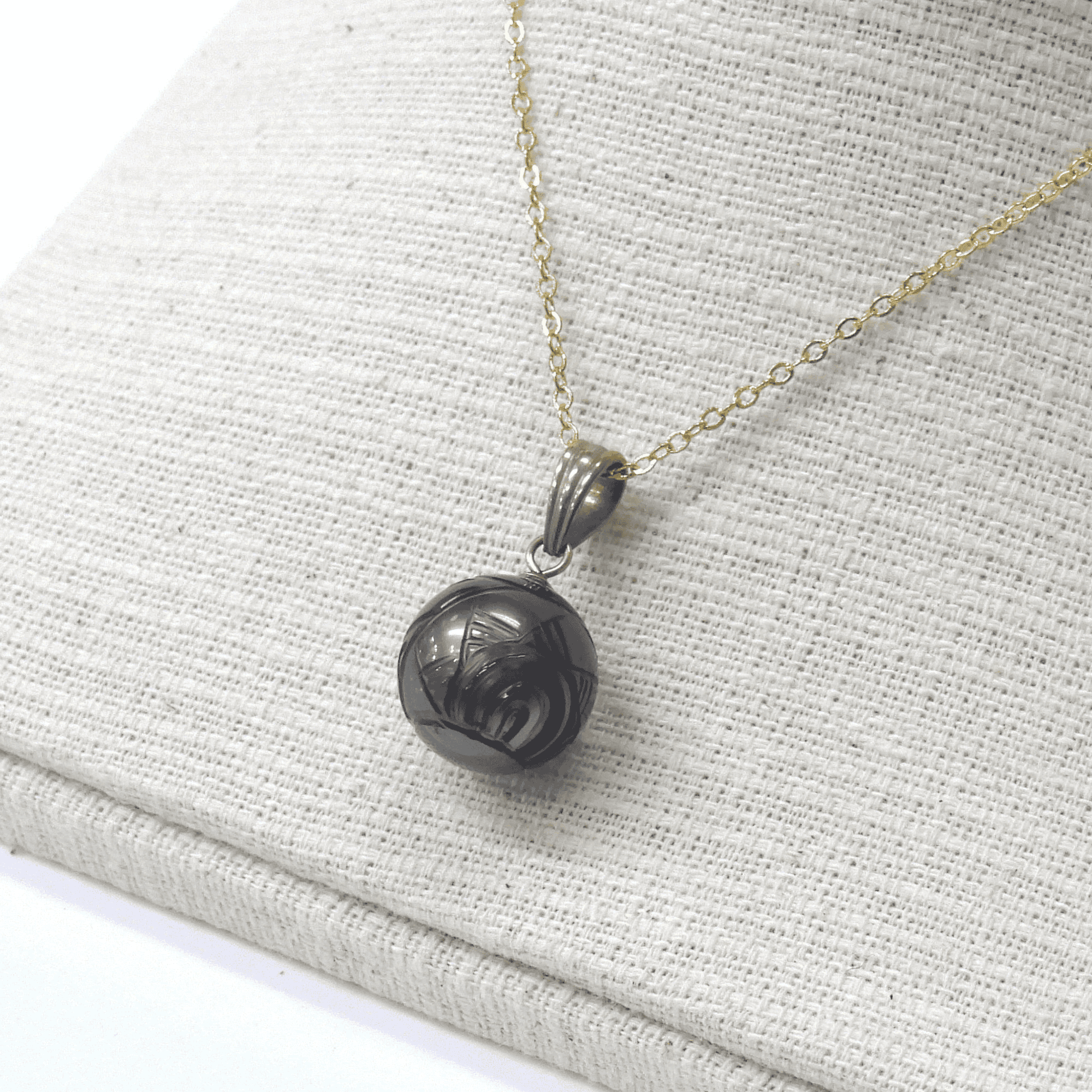 Carved Black Pearl Pendant with Polynesian tattoo designs, limited stock available.